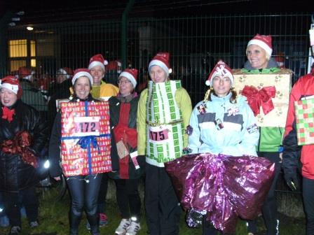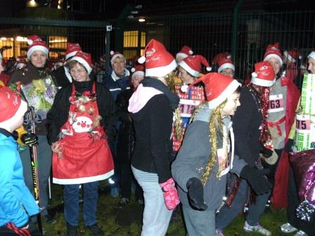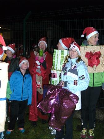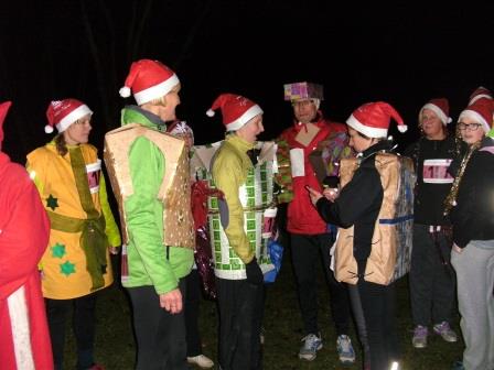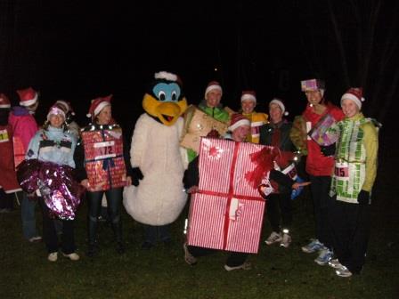 Außerdem gab es an mehreren Punkten live Musik und der Weg am See und im Wald war romantisch mit Fackeln beleuchtet. Tragen der Zipfelmütze war Pflicht, und es wurde auch die beste Verkleidung gewählt: Unsere DSVer waren als 35 „Geschenke“ vom Duvenstedter Sportverein unterwegs und haben für diese Verkleidung einen Preis gewonnen - herzlichen Glückwunsch dazu! Sabine war mit Abstand das größte Geschenk, wie man auf den Fotos sieht (Einige hatten liebevoll Anhänger mit der Aufschrift „für Sabine“ an ihren Paketen !). Die Zuschauer waren davon sehr angetan und sprachen die Geschenke unterwegs ständig an, wann denn die Pakete ausgepackt werden dürfen, oder ob man (na, eigentlich eher Mann :-) ) mal fühlen dürfe, was da drin ist ….