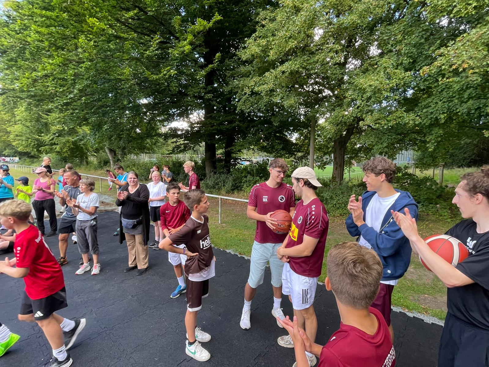 Und so strahlte auch Projektleiter Noah Klünder über beide Ohren, als der DSV-Vorsitzende Oliver Stork ihm für die erfolgreiche Planung und Umsetzung des Platzbaus den großen Dank aller DSVerinnen und DSVer aussprach und ihm einen Basketball mit allen Unterschriften des Vorstands- und Geschäftsstellenteams überreichte.